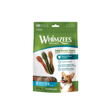 Whimzees er vegetariske, kornfri tyggeben designet til at støtte din hunds tandhygiejne – helt uden kunstige tilsætningsstoffer. Med sjove og funktionelle former som tandbørster og alligatorer, kombinerer Whimzees tyggeglæde med effektiv rensning af tænderne.